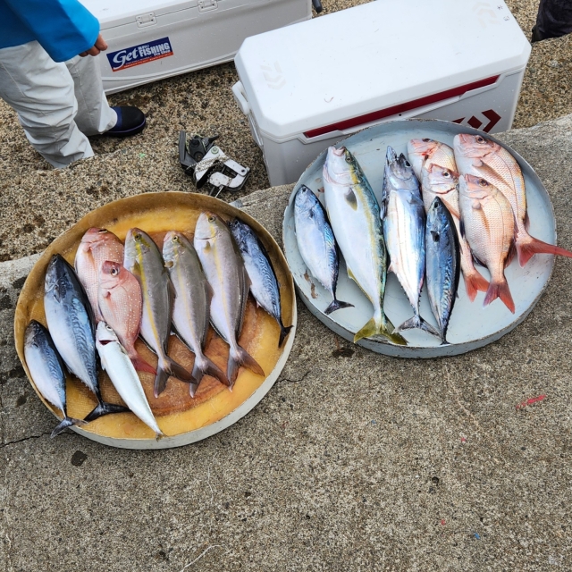 🎣マダイ五目🎣 本命マダイget✨ 他にも色々当たり ショゴ(カンパチ)、イナダ、ハナダイ 本ガツオ、ヒラソウダガツオ、サバ 当たり多く1日楽しめました😊👌 風強い中 本日は乗船して頂き ありがとうございました🙇♂️ またのお越しをお待ちしております🙇♂️
