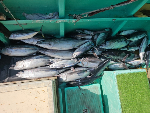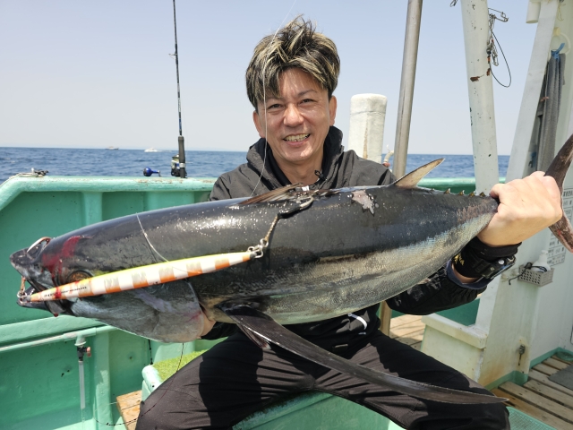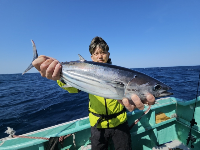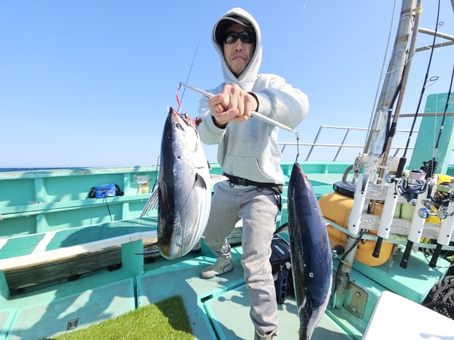 トンボ 6-11kg 3-5本 カツオ 2-3cm 3-7本 朝イチは鳥が集まる所から。 浅目の棚で狙ってたカツオ。 カツオがメインで欲しかったので、 下にトンボが回遊するも浅棚(笑) カツオはそこそこ釣れたので、 深場も攻めてみたら?って言うと、 180mでヒットしたのはトンボ。 深いせいか連鎖せず、 トンボ狙いでポイント移動。 着いて1投目でヒット! そこから操舵席に戻る暇なし! 体力不足なのか釣れるのに休憩(汗) 休憩をしながら交代で下ろせば、 すぐにヒット~! ほぼ入れ食い状態なんですが、 クーラーBOXに入らないので、 早上りで、って事で港に。 何はともあれカツオもトンボも全員安打!