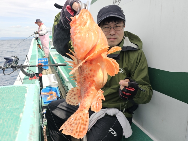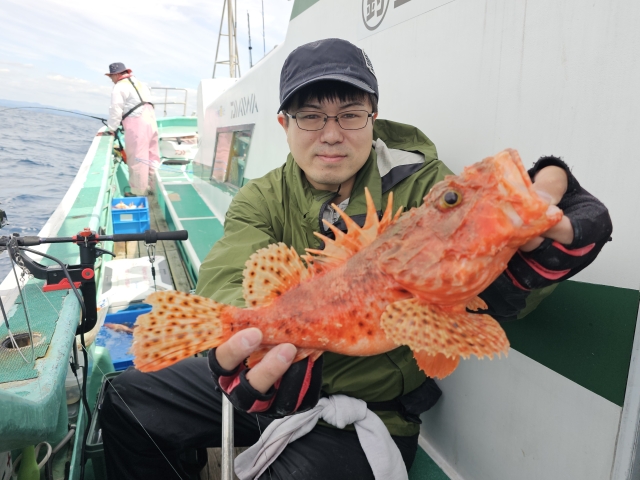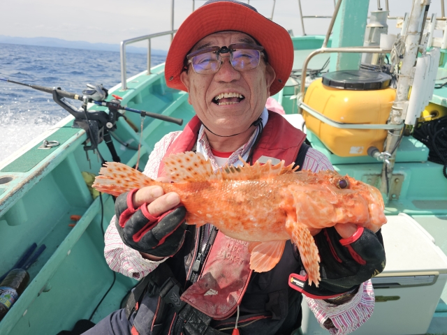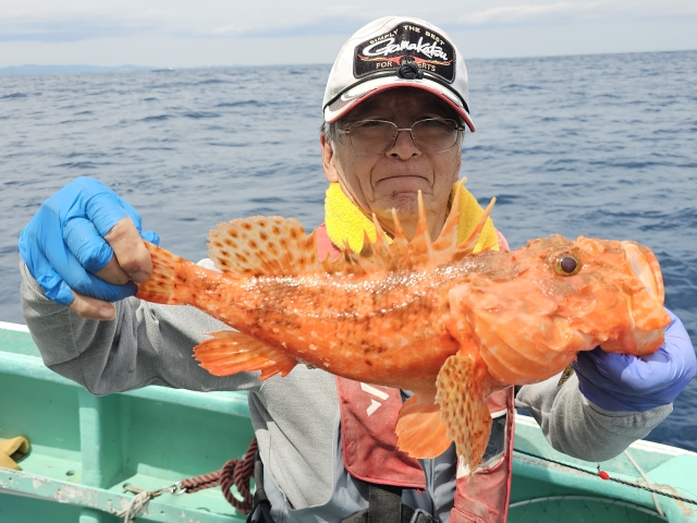 オニカサゴ 20-42cm 2-14匹 アヤメカサゴ 20-25cm 8-15匹 ウッカリカサゴ 24-32cm 1-3匹 ヒオドシ 26cm 1匹 昨日の大荒れの影響で、 ウネリが高い志摩沖へ。 私の胃カメラの主治医、 赤坂クリニックの先生が、 鬼カサゴ14匹の竿頭! 鬼カサゴ2回目の乗船? の方は、船酔いしながらも、 最後まで頑張り良型2匹。 明日と明後日も鬼乗り合い! どちらも余裕がありますので、 お時間ありましたら宜しくです。 水温19.5度~19.9度
