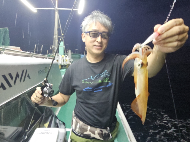 アカイカ 16-23cm 2-15杯 半夜便でアカイカ狙いで出船。 7名様の乗り合いで出船しました。 初イカメタルの方もみえました。 その方が見事に竿頭! とりあえずは全員安打でした。 アカイカ、15杯、13杯2名、 9杯、7杯、6杯、2杯。 暗くなってからの初当たり。 時合いらしい時合いも無く、 ポツポツの釣果でした(汗) 本年度のアカイカも終盤かな?! とはいえ、まだ狙えます! サバフグはゼロで救いでしたが(苦笑) 小サバは何匹かは釣れてました。 水温26.8度