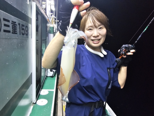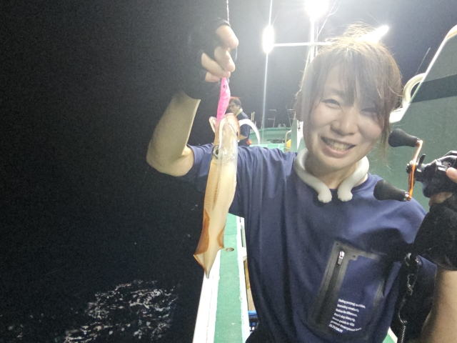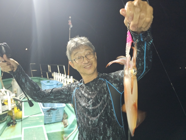アカイカ 15-23cm 10-18杯 半夜便アカイカ乗り合いで出船。 アカイカ10杯~18杯! お客様に混じって、 地元では有名な方も乗船でした(笑) サバフグは全く無しで何より。 当りはポツポツでした。 竿頭は岐阜の加藤様(夫)で18杯! 名古屋の小川様の会社の同僚。 小川様は惜しくも17杯。 全員安打で全員がツ抜け! 水温28.5度