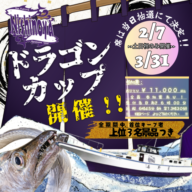 タチウオ80-120 cm 0-5 匹 アジ18-28 cm 25-52 匹 ▼船長より 本日LTア&タチウオのリレー船(^^)/ 13名様お集まり頂き出船できました。 午後から風が強まる予報でしたので、まずタチウオから!まず1か所目は潮止まりスタートのせいか反応あるも食い渋く、すぐ移動。2か所目は先ほどよりアタリは増えましたが、貸し竿や初挑戦の方も多く、次第に風と波が早めに大きくなり釣りづらいのも相まって打率は低め(^_^;)トップ5本の、最大は120センチ!久しぶりにドラゴンサイズを見れました〜(*^_^*)✨️長めにやりたかったですが、なかなかの時化模様でしたので諦めてLTアジにチェンジ! アジは真っ直ぐ風影ポイントへ!1か所目からポツポツとサイズも中型がポツポツ混ざってくれて、そのまま最後まで好調でした(^_^)v✨️ アジは午前中はかなり厳しかったようですので、たまたま始めたタイミングが良かったようです(^_^;) 時化の中での操船でしたので、写真はほぼ撮れずm(_ _)m ★-------------★ ▼お知らせ ■ドラゴンカップ開催決定!! 開催期間 2026/2/7~2026/3/31 土日祝日のみ 全期間中におけるサイズ上位3名景品あり!! ※参加者全員に別途参加賞があります ■釣船予約の予約受付終了について 公式発表のとおりアングラーズアプリからの新規ご予約受付が1/30(金)を以て承れません。 以降のご予約につきましては弊社公式LINEからお手続きくださいますようお願い致します。 ※釣果投稿は引き続き同アプリでも行いますので、ぜひご確認ください ▼ご予約はこちらから かんたんLINE予約で24時間受付 https://page.line.me/?accountId=nishinoya_fishing ※再利用の方は会員証または会員番号をお手元にご用意のうえご予約ください ▼今後の出船予定 1/31(土) タチウオ船 2/1(日) リレー(LTアジ/タチウオ)船 3/7(土) ドラゴンカップ※リレー(LTアジ/タチウオ)船 ▼運休日 2/6・13 上記日程ではお休みを頂いております。 ※別途、乗合船のみ毎週火曜日が運休です。 ★-------------★